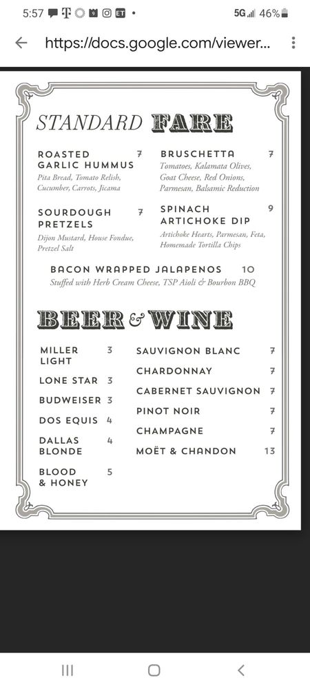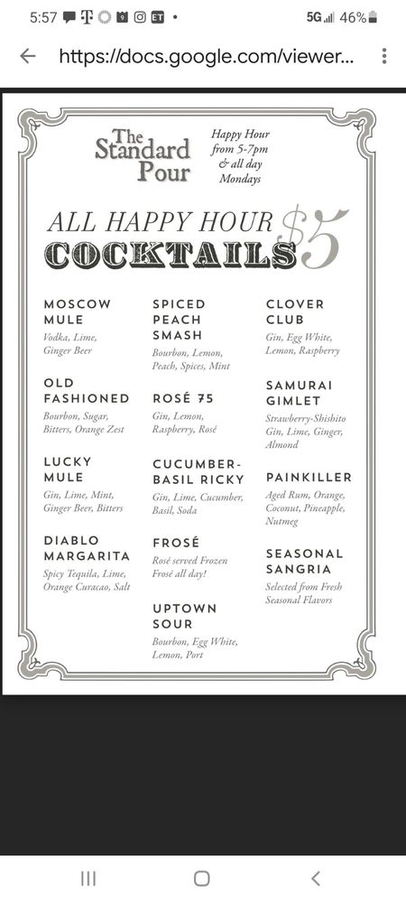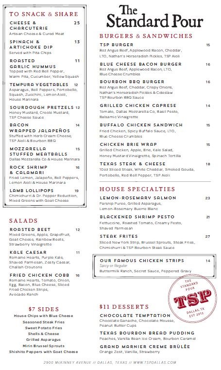 The Standard Pour, located in Dallas, TX, is a trendy gastropub and cocktail bar that offers a unique New American menu. This establishment is known for its vegan options, wheelchair accessibility, and a variety of payment options, including cryptocurrency. With features like outdoor seating, free Wi-Fi, and a pool table, The Standard Pour is a great spot for groups or a night out dancing. The menu includes happy hour specials, full bar options, and catering services. The best nights to visit are Wednesday, Friday, and Saturday. Overall, The Standard Pour provides a vibrant and inclusive atmosphere with a diverse menu to satisfy all tastes.